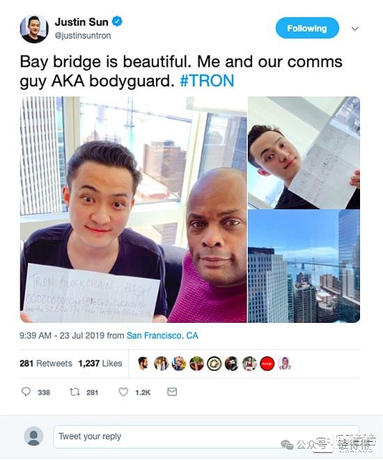 同时,孙宇晨在其推特上连发两条推文,背景都展示出其在旧金山的家中,以及背后的旧金山的标志性建筑海湾大桥。
