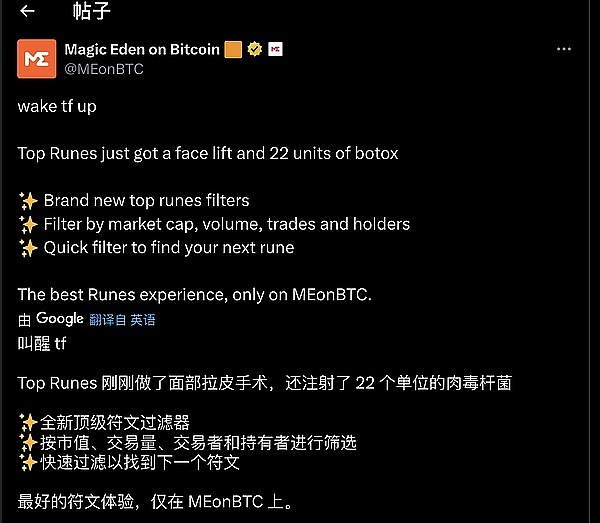 ● Top Runes 界面升级,全新顶级符文过滤器。按市值、交易量、交易者和持有者进行筛选。快速过滤以找到下一个符文。 @MEonBTC
