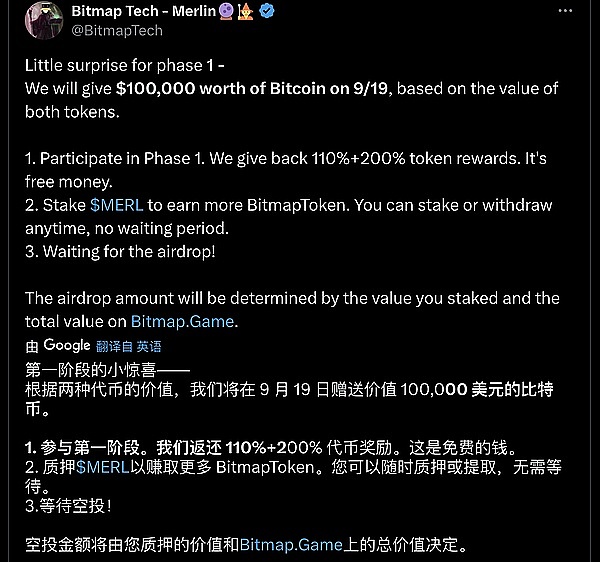 @BitmapTech 将会空投 10 万美金等值的 BTC,给所有用 BitmapToken 和 MERL 参与活动的人 1. 参与第一期活动,你的 BitmapToken 损耗我们将会给与 110%(首次损耗)+200%(日损耗)的奖励。这就是 0 成本的白嫖。2. 如果你投入了 MERL 到池子里,将会在每秒收到所有用户消耗 BitmapToken 的收入,边吃奖赏/边拿池子的收益。3. 等到 9/19 给所有参与者空投,共计 10 万美金。Jeff 补充道:这还只是 Bitmap 的第一期(420 万个 BitmapToken 和 10 万 u),这两个月 Bitmap 将会有 7 期。Merlin 生态的其他空投也在 incoming…)