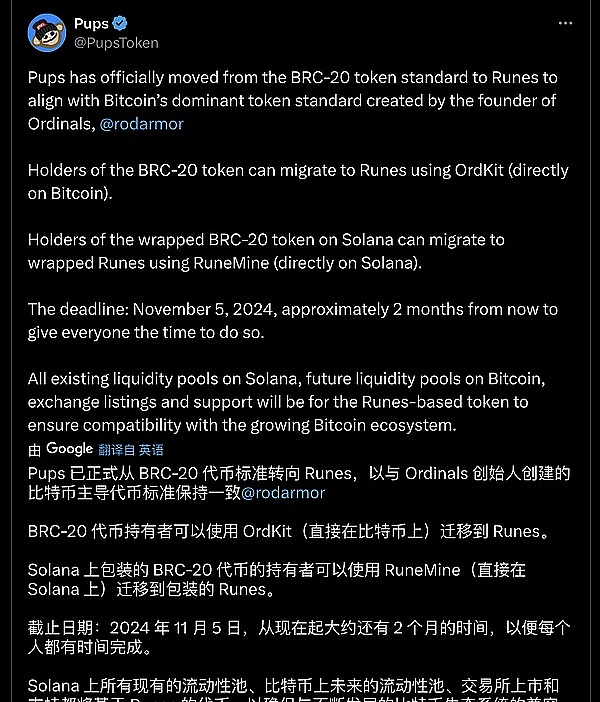 BRC-20 代币的持有者可以使用 OrdKit(直接在比特币上)迁移到 Runes。Solana 上包装的 BRC-20 代币的持有者可以使用 RuneMine(直接在 Solana 上)迁移到包装的 Runes。截止日期 2024 年 11 月 5 日,大约 2 个月时间。