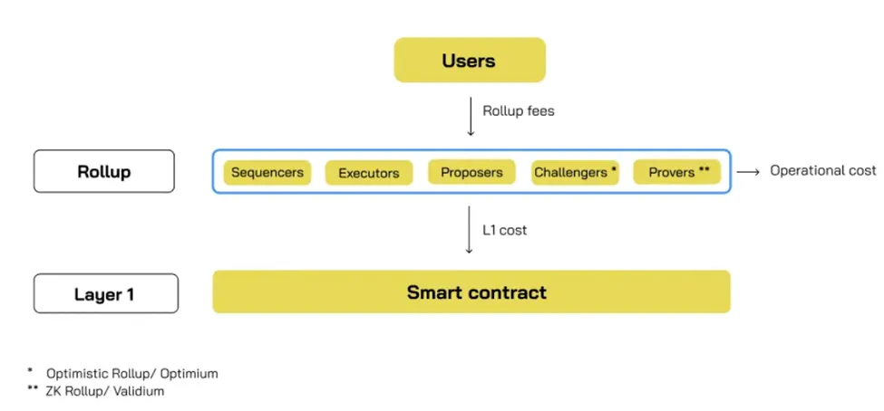 以太坊等基础层网络通常因大多数节点需要同步和验证链而对计算和存储收取更多费用。然而,在 Rollup 中,即使只有一个诚实实体能够验证链,该链也被认为是安全的。因此,Rollup 对计算和存储的收费较低,但对 rolling up 交易到打包并发布到 L1 的费用较高,导致 L1 成本在 EIP 4844 推出前,占到 L2 成本基数的 98%。