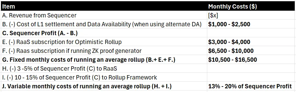 尽管在行业层面和个别链层面进行了各种优化,仍需要每月总计 10,500 至 16,500 美元的费用用于 ZK Rollup,以及 4,000 至 6,500 美元用于Op Rollup,此外一旦链开始盈利,排序器利润还需分享多达 20%。