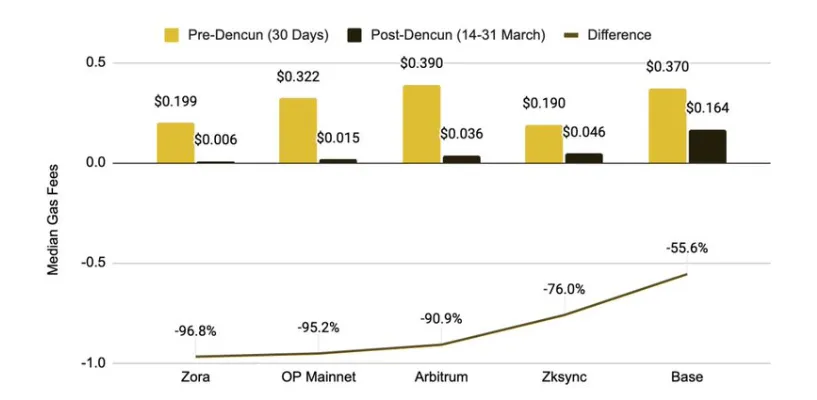 Blob 的实施使交易成本大幅下降,原因在于每字节的存储成本降低以及每个区块容量的扩展,因为 Blob 与以太坊交易不争夺 Gas,并且不会永久存储,在大约 18 天后会从区块链中删除。