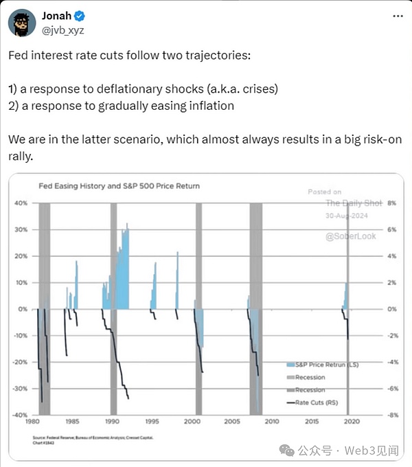 现在,美联储通常会出于两种原因之一降息:应对通货紧缩冲击或应对逐步缓解的通胀。从历史上看,第二种情况几乎总是会导致大幅风险偏好反弹,即股票或加密货币等风险市场出现反弹。