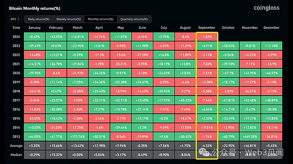 现在我不会责怪任何人分享这个 Coinglass 图表并说九月是最悲观的月份,因为就九月收盘价而言,它是最悲观的月份。