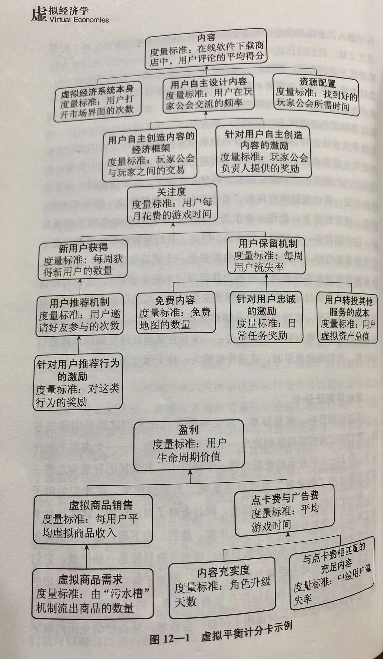 在威利•莱顿维塔和爱德华•卡斯特罗诺瓦撰写的《虚拟经济学》一书中,提到在如果为游戏经济体制设计一个虚拟平衡计分卡的话,其中分为三大终极目标:内容、关注度和盈利。