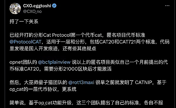● Cat Protocol @ProtocolCAT 第一个代币 cat,适用于一层主网和 Fractal,含括 2 个代币标准 CAT20 和 CAT721。目前 opnet 团队 Danny,和量子猫团队 Rijndael 都对此表示不服,均表示自己才是正主。大家怎么看?