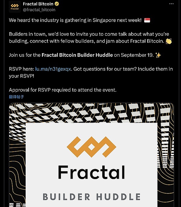 ● Fractal @fractal_bitcoin 团队与 9.19 号在新加坡举办 Fractal Bitcoin Builder Huddle 聚会。