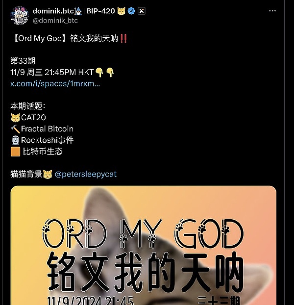 ● 【Ord My God】今晚 9:45 分 space 会聊 Cat20,Fractal,Rocktoshi 事件,Alpha 等。by @dominik_btc, @lilyanna_btc, @OrdzWorld, @CoethCo