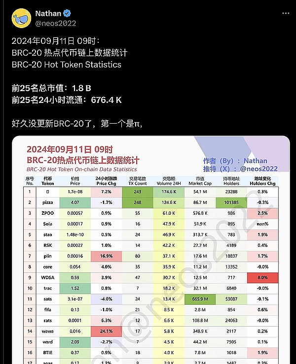 ● BRC20 热门代币链上数据统计,前 25 名总市值 1.8 B。前 25 名 24 小时流通 676.4 K。
