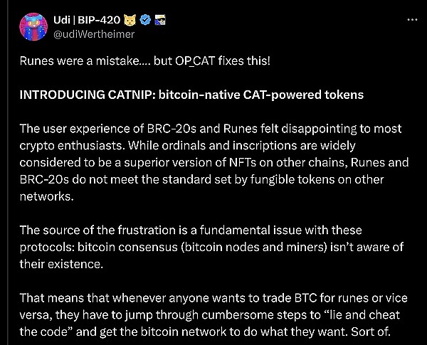 ● 大巫师团队 @udiWertheimer @rot13maxi 发布 CATNIP 概念,基于比特币的 CAT 代币协议。