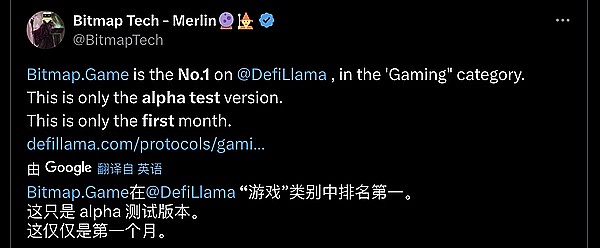 ● Bitmap Game @BitmapTech 在 @DefiLlama 的「游戏」类别中排名第一。