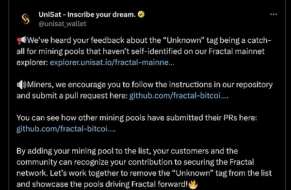 ● Unisat @unisat_wallet 表示,减少矿池未知标签,鼓励矿池添加到列表中,以便展示客户和社区可以认可该矿池为保护 Fractal 网络所做的贡献。