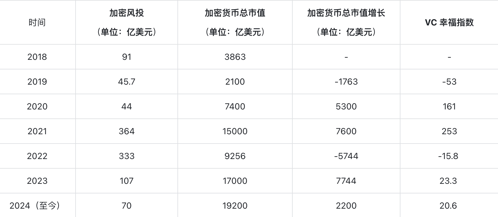 行业视角下,过度投资和错误定价的恶果正在显现。我们在 2021 年提出了「VC 幸福指数」指标,计算方式是使用当前周期加密货币市值增长除以上一个周期区块链行业融资总额。这个指标的逻辑也很简单,VC 投资的目的是产生盈利,那么他们的投资需要通过下一个周期的市值增长来兑现。这个指标越高,VC 赚取高收益的概率就越大。