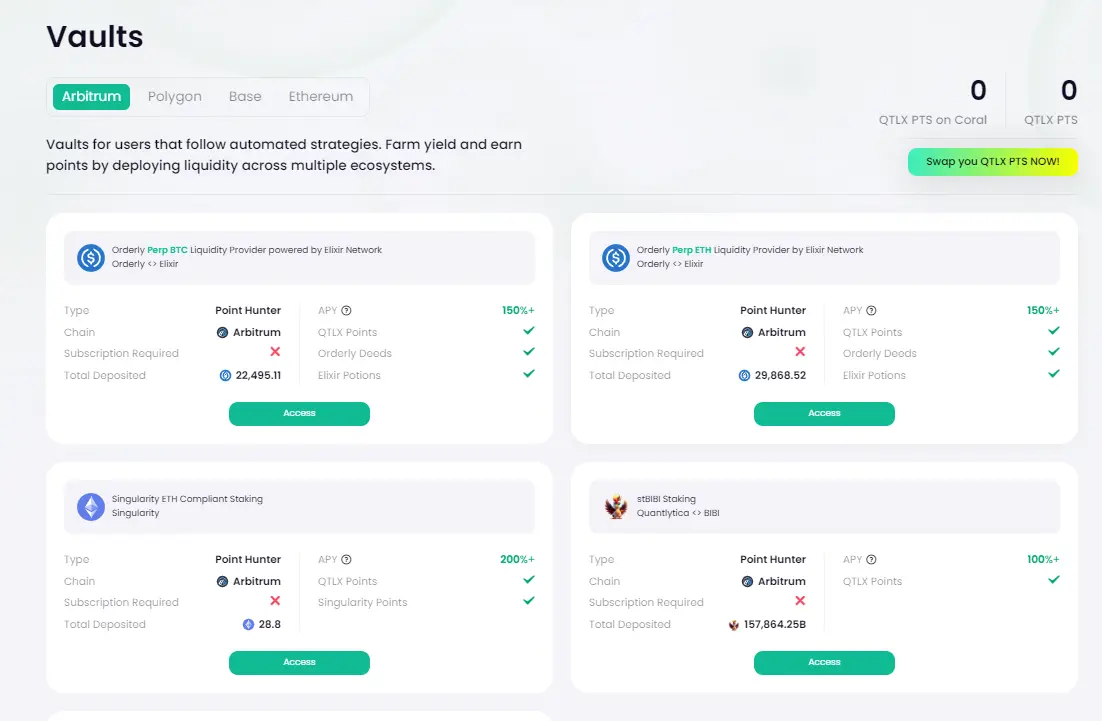 如Ordely PreBTC金库是为流动性平台Elixir提供流动性,用户只需存入USDC,就可以获得Quantlytica积分,还有Elixir积分+Ordely奖励+积分平台Coral Finance的Token奖励,相当于一鱼四吃。
