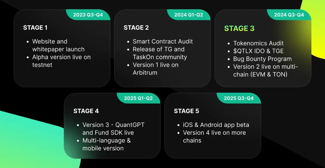 代币TGE之后,Quantlytica除会上线QTLX代币锁仓功能及活动,还会在多链上进行部署扩展,如Base、Polygon等EVM链及非EVM的Solana、Ton等。