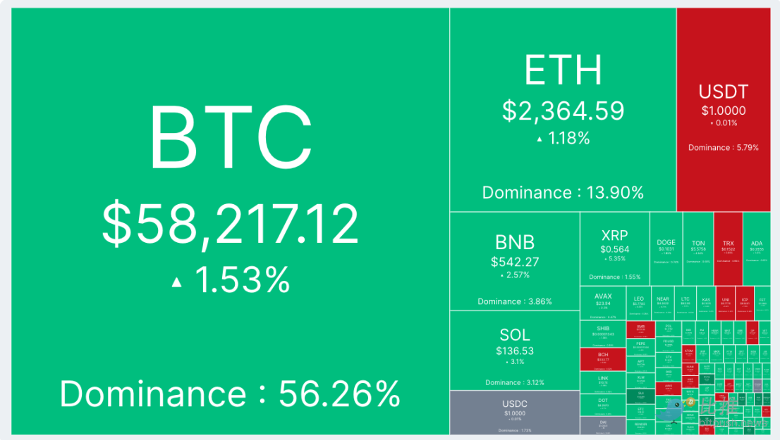 截至发稿时,比特币交易价格为 58,217 美元,24 小时涨幅 1.53%。