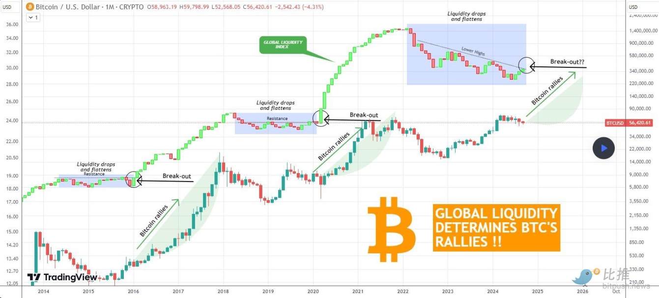 TradingView 分析师 TradingShot 表示,降息将导致全球货币供应量增加,这可能是推动比特币下一轮上涨的因素。