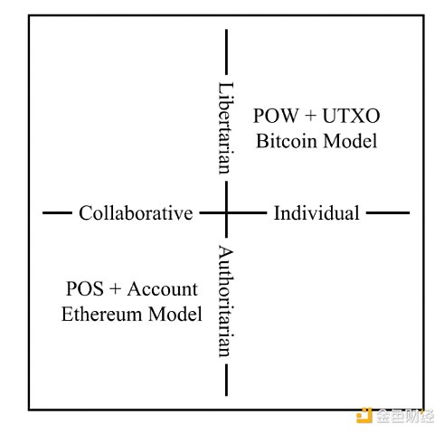 将 PoW 与可编程 UTXO 模型相结合,还能实现一种强调个人自由竞争的独特治理形式。首先,在 PoW 模式下,矿工通过个人努力竞争奖励。这与 PoS 不同,PoS 需要一个合作的集体机构来进行投票或质押。其次,由于每个 UTXO 都是离散的资产,用户可以自由转移和交互,无需中央机构的许可。与此相反,账户模式以中心化方式管理资产,类似于威权主义,少数大型利益相关者影响网络的方向。因此,如图 2 所示,我们可以将 POW + UTXO 和 POS + Account 放入政治光谱中。PoW + UTXO 属于自由主义 - 个人(Libertarian-Individual)象限。POS + Account 属于威权主义 - 集体(Authoritarian-Collaborative)象限。这两种方法的鲜明对比凸显了其基本理念和所属系统类型的根本差异。PoW + UTXO 组合符合比特币的 P2P 愿景,倡导个人自由、去中心化和参与者之间的直接互动,而 PoS + Account 模式则与这些原则有很大的不同。通过了解不同区块链设计的政治和哲学基础,我们可以对构建和参与的哪一种系统做出更明智的决定,确保我们始终忠实于 P2P 模式的变革潜力。