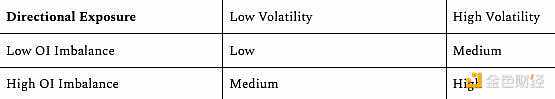 另一方面,LP 向 MMV 存款的最大风险是定向敞口风险;当 LP 面临基础市场价格突然变化时,就会发生这种情况,这是由高 OI 不平衡和高波动性同时发生造成的。以下矩阵说明了定向敞口风险如何相应变化: