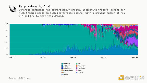 以太坊在永续合约交易量中的主导地位已大幅萎缩,表明交易者对高性能链上的高交易永续合约的需求,而越来越多的新 L1 和 L2 可以满足这种需求。