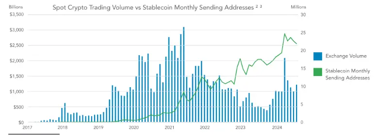 (上图显示,即使在 CEX 交易量低迷,加密市场走入低谷时,稳定币的月发送地址有增无减,说明稳定币的采用不仅限于加密交易 / 投机环节)