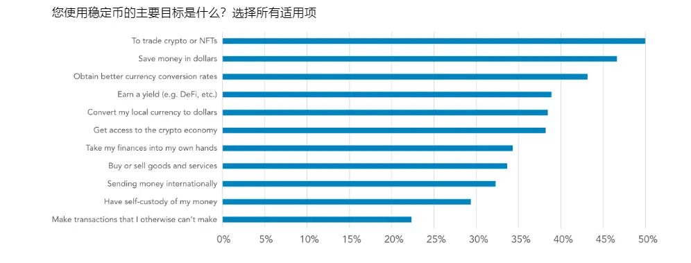 样本中稳定币用户最受欢迎的目标是交易加密货币或 NFT,但其他非加密货币用途也不甘落后。