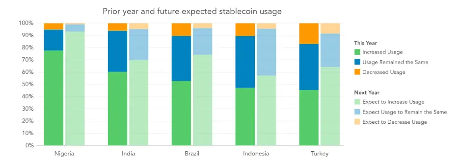 研究结果很明确:在接受调查的国家 / 地区,非加密使用在稳定币使用模式中占有相当大的份额。