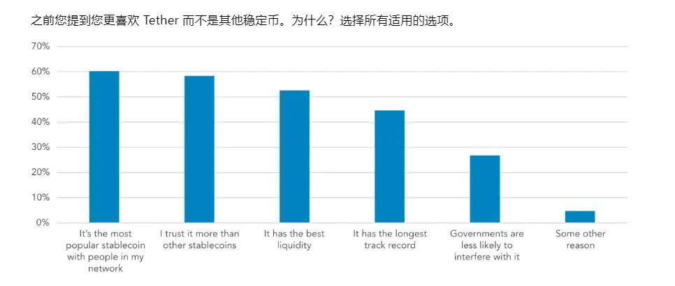 许多人报告说,出于习惯而坚持使用 USDT,但如果围绕他们的网络中出现替代稳定币的共识,他们会更换稳定币