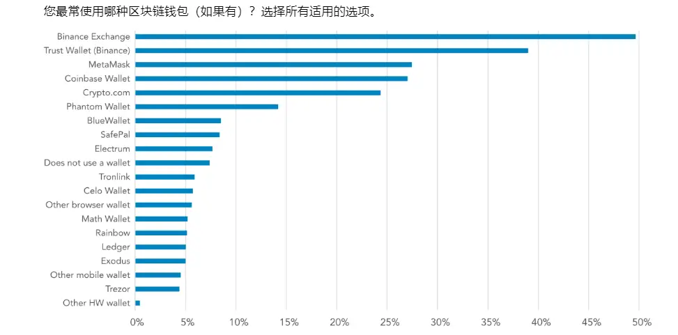 受访者中最受欢迎的钱包是 Binance(交易所),其次是 Trust 钱包、Metamask、Coinbase 钱包、crypto.com 和 Phantom 钱包。使用钱包调查中呈现出明显的长尾效应