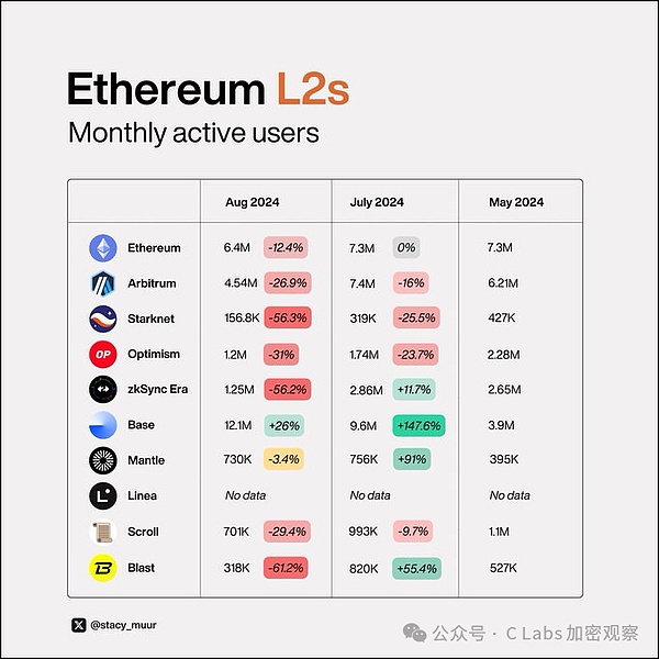 Stark/Zksync为代表的zk链用户更是疯狂流失,8月的数据对比7月就直接腰斩。