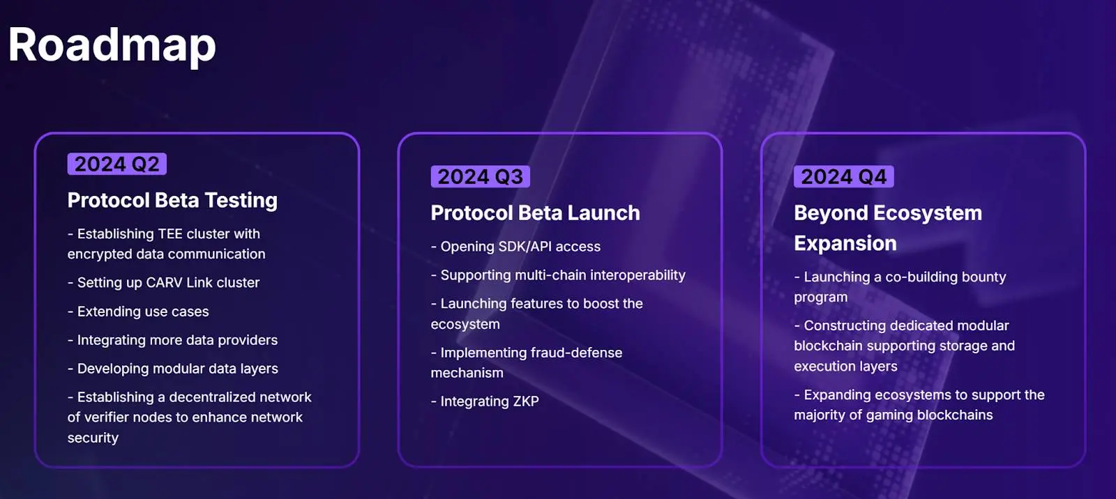技术方面:2024 年第三季度,CARV 协议 Beta 版本将发布,包括开放 SDK / API 访问、支持多链互操作性、整合 ZKP 等;到了 2024 年第四季度,团队将致力于构建支持存储层和执行层的专用模块化区块链。
