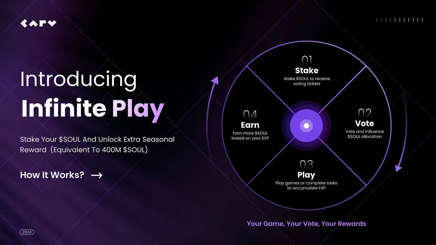 而在代币 TGE 之外,CARV 生态不乏多种多样的奖励活动以鼓励用户积极参与,Infinite Play 便是其中的集大成者:用户可参与质押获得 Stake to Earn 收益,质押时间越长,回报越丰厚;可通过参与治理投票获得 Vote to Earn 收益;还可通过完成不同游戏任务积累经验值获得 Play to Earn 收益,在享受游戏乐趣的同时,真正体验数据主权与去中心化自治社区的魅力。
