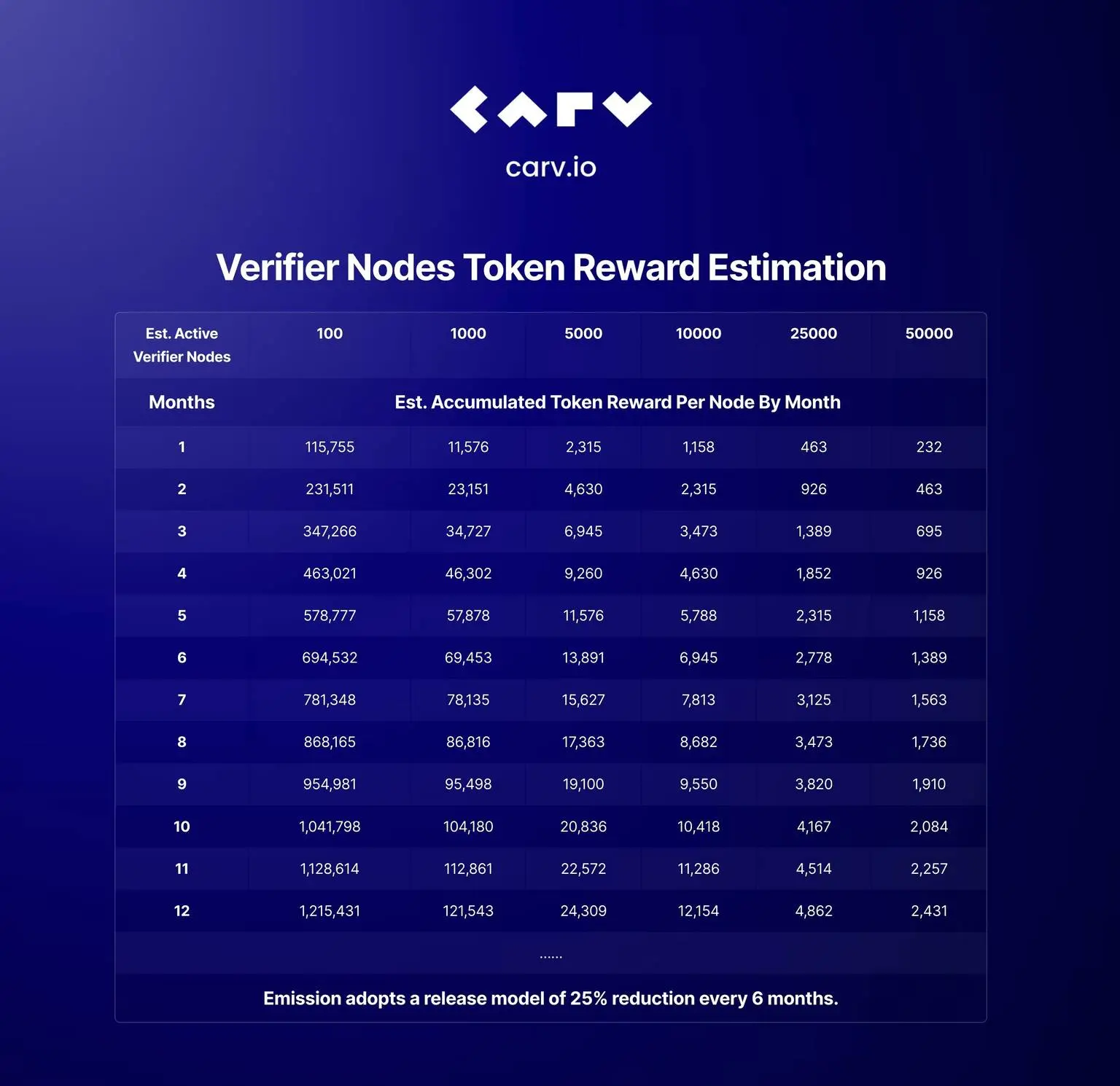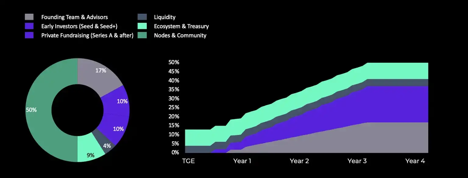 与此同时,高达 25% 的 CARV 代币供应将分配给节点奖励,不仅第一年释放 50%(也就是总供应量的 12.5%),且代币赎回时间为 150 天,而投资人解锁时间为 6 个月,团队解锁时间是 9 个月,节点代币早于投资人和团队解锁,这也充分体现了 CARV 通过节点销售模式和用户共享收益给出的最大诚意。