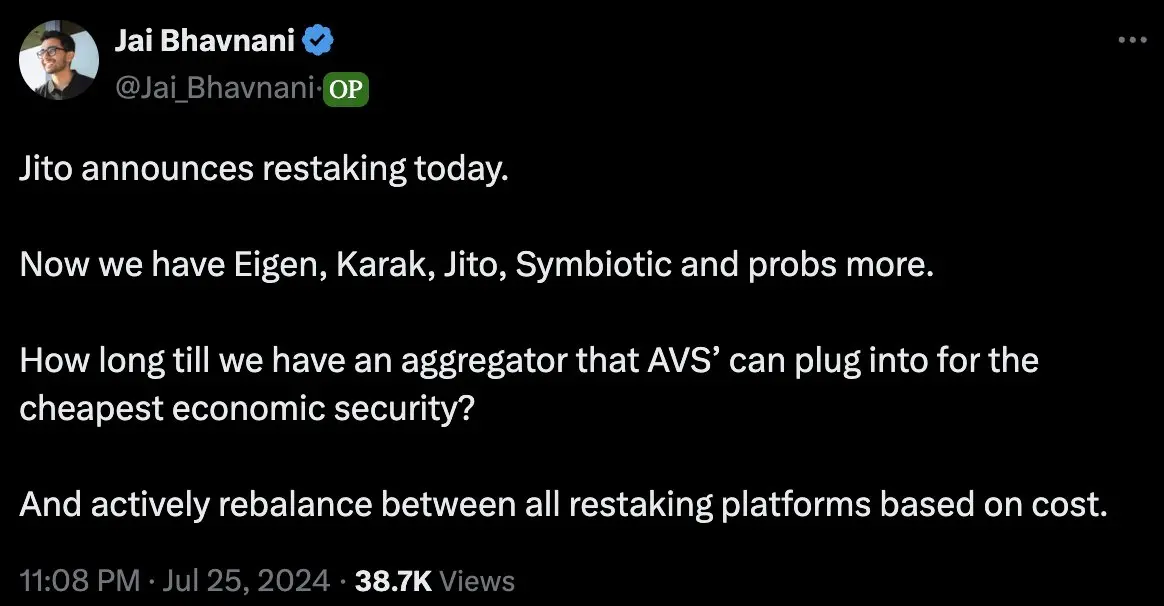 Jai Bhavnani:“Jito 今天宣布支持再质押。 现在我们有 Eigen、Karak、Jito、Symbiotic 等,可能还有更多。 我们要多久才能拥有一个聚合器,让 AVS 可以接入以获取最经济的安全保障? 并能根据成本在所有再质押平台之间主动进行重新平衡。”