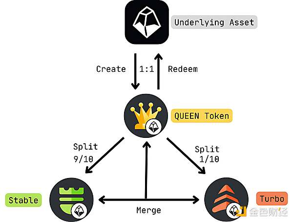 STONE 基金的核心在基于 Turbo&Stable 架构的代币拆分机制。用户可以将 STONE 按 1:1 的比例兑换为 stoneQUEEN,而每个 stoneQUEEN 可以拆分为 0.1 个 turPSTONE(Turbo Point STONE) 和 0.9 个 staYSTONE(Stable Yield STONE)。同时,这个过程是可逆的,用户可以将 0.1 个 turPSTONE 和 0.9 个 staYSTONE 合并回 1 个 stoneQUEEN。
