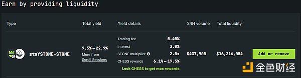 这些 LP 代币持有者不仅可以获得 CHESS 代币和 0.05% 的交易手续费奖励,同时享受部分 staYSTONE 的利息以及 2 倍的 StakeStone 积分乘数 (针对 LP 中的 STONE 部分)。除此之外还有 Tranchess 对 STONE 基金的 LP 提供每周 150000 个 CHESS 的额外奖励。