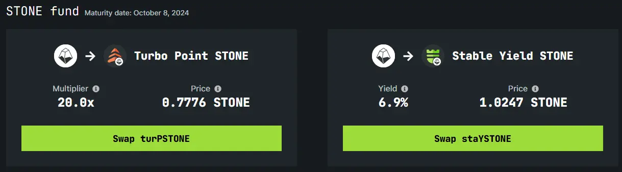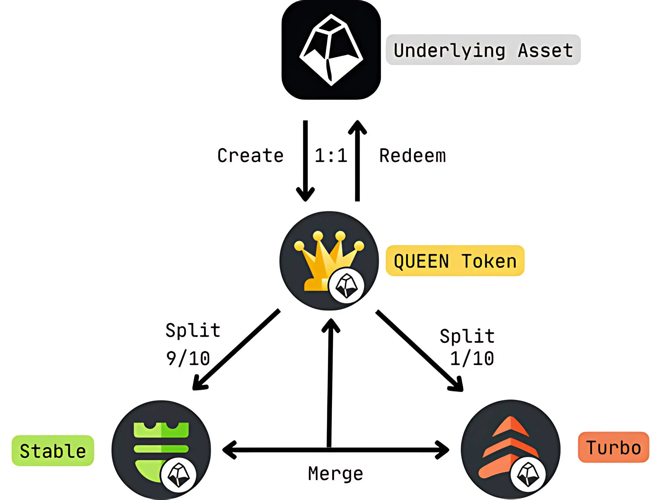 STONE 基金的核心在基于 Turbo&Stable 架构的代币拆分机制。用户可以将 STONE 按 1:1 的比例兑换为 stoneQUEEN,而每个 stoneQUEEN 可以拆分为 0.1 个 turPSTONE(Turbo Point STONE) 和 0.9 个 staYSTONE(Stable Yield STONE)。同时,这个过程是可逆的,用户可以将 0.1 个 turPSTONE 和 0.9 个 staYSTONE 合并回 1 个 stoneQUEEN。
