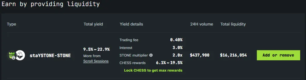 这些 LP 代币持有者不仅可以获得 CHESS 代币和 0.05% 的交易手续费奖励,同时享受部分 staYSTONE 的利息以及 2 倍的 StakeStone 积分乘数 (针对 LP 中的 STONE 部分)。除此之外还有 Tranchess 对 STONE 基金的 LP 提供每周 150000 个 CHESS 的额外奖励。