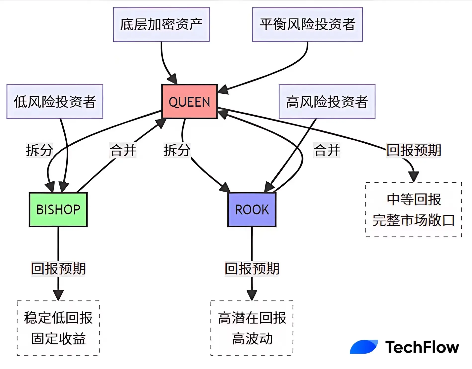 QUEEN 是基础资产,与底层加密资产 1:1 挂钩。在整个结构中作为主要基金单位,用户可以直接持有 QUEEN 来获得对底层资产的完整敞口。QUEEN 可以铸造、赎回,以及拆分为 BISHOP 和 ROOK。QUEEN 的收益来源包括底层资产的价格变动、质押奖励(如果底层资产支持质押)以及协议收入分配。