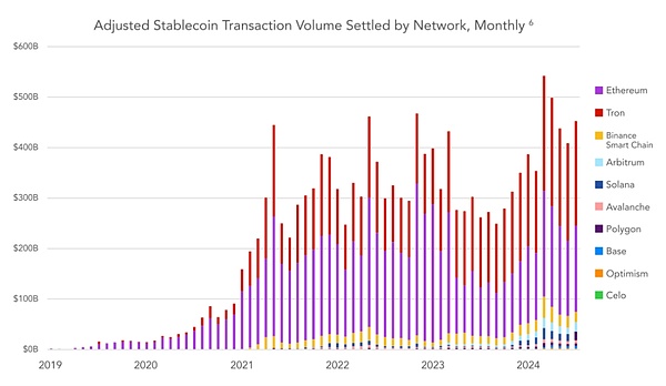 这再次表明,稳定币已经吸引了一批新的用户,他们不仅仅对使用它们进行交易所结算感兴趣。截至 2024 年 6 月,按结算价值计算,最受欢迎的区块链依次为 Ethereum, Tron, Arbitrum, Base, BSC 和 Solana。