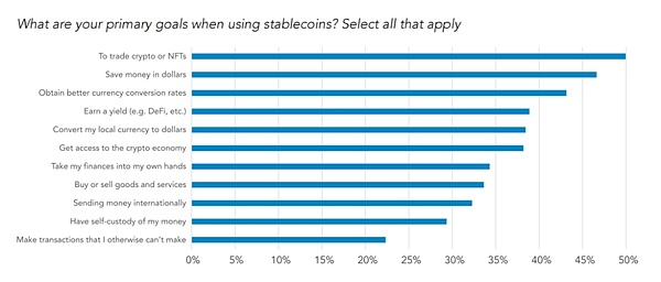 样本中稳定币用户最受欢迎的目标是交易加密货币或 NFT,但其他非加密货币用途也紧随其后。总体而言,47% 的受访者表示他们的主要目标之一是节省美元,43% 的受访者提到更好的货币兑换率,39% 的受访者表示赚取收益。