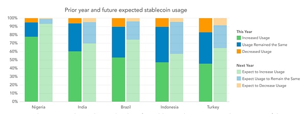 到目前为止,最受欢迎的用途是货币兑换,其次是购物和跨境交易。值得注意的是,样本中所有国家的大多数受访者都表示,他们曾将稳定币用于非加密货币交易用例。在所有接受调查的国家中,稳定币的使用量都在不断增长。大多数受访者表示,他们的使用量在过去一年有所增加,甚至有更大比例的受访者表示,他们将在未来一年进一步增加使用量。