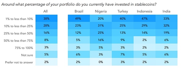 对于稳定币在用户投资组合中的渗透程度。在国家层面,尼日利亚人的比例远远高于样本中的其他人群,其次是土耳其和印度。在印度用户样本中,最富裕群体的受访者还表示,他们的金融投资组合中稳定币的比例更大。