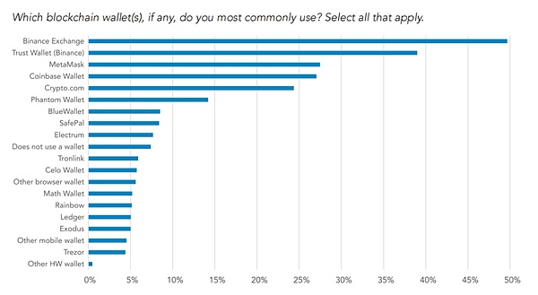 受访者中最受欢迎的钱包是 Binance,其次是 Trust Wallet、Metamask、Coinbase Wallet、Crypto.com 和 Phantom 钱包。