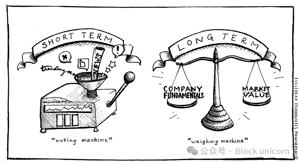 格雷厄姆——被认为是价值投资之父,他亲眼目睹了这段动荡时期,在大萧条期间遭受了严重损失,这促使他从基本原则重新思考自己的投资方法。在此过程中,他创建了一个详细的框架,通过基本面研究和分析来确定股票的真实价值或内在价值。价值投资与 20 世纪 20 年代盛行的投机泡沫截然不同,它基于这样一种理念:特定资产的市场清算价格并不总是表明其真正的潜在价值。相反,格雷厄姆将市场视为一种受投资者情绪驱动的不稳定定价机制,这一概念在他著名的类比中得到了体现,他将市场比作投资者的商业伙伴,名为「市场先生」,他每天愿意以不同价格买卖公司股票,取决于他的心情。换句话说,市场是一台短期投票机,但也是一台长期称重机。