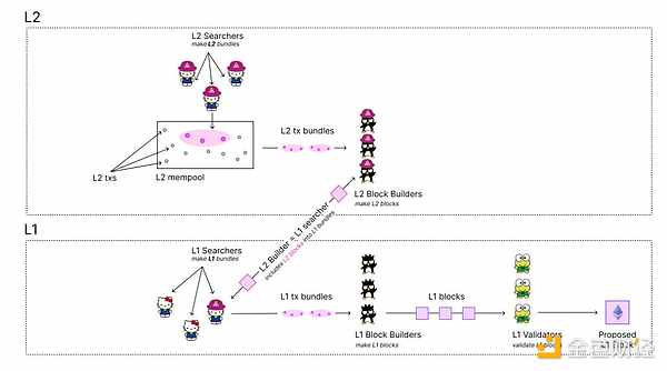 2023 年 3 月,Justin Drake 发布了文章「Based rollups—superpowers from L1 sequencing」,进一步明确了 Based Rollup 的概念。当 Rollup 的排序由 L1 驱动时,称其为 Based Rollup 或 L1 排序的 Rollup。在这种架构下,Rollup 区块的生成和排序是通过 L1 上的提议者进行的,L1 的提议者可以与搜索者和构建者合作,将 Rollup 区块直接包含在 L1 区块中。值得注意的是,默认情况下,Based Rollup 区块由 L2 构建者构建。因此,Based Rollup 并不会增加 L1 验证者的负担。