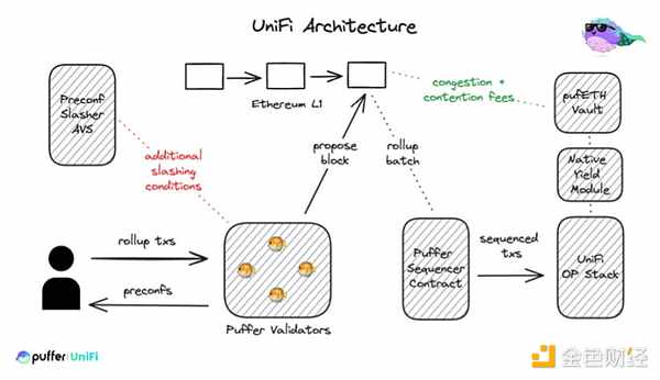 Puffer Finance 也推出了基于预确认机制的 Puffer UniFi 解决方案。作为 Based Rollup,UniFi 上的交易排序外包给了以太坊 L1 ,而 Puffer UniFi 的预确认机制则是通过 Puffer 的原生重质押验证者来实现的。