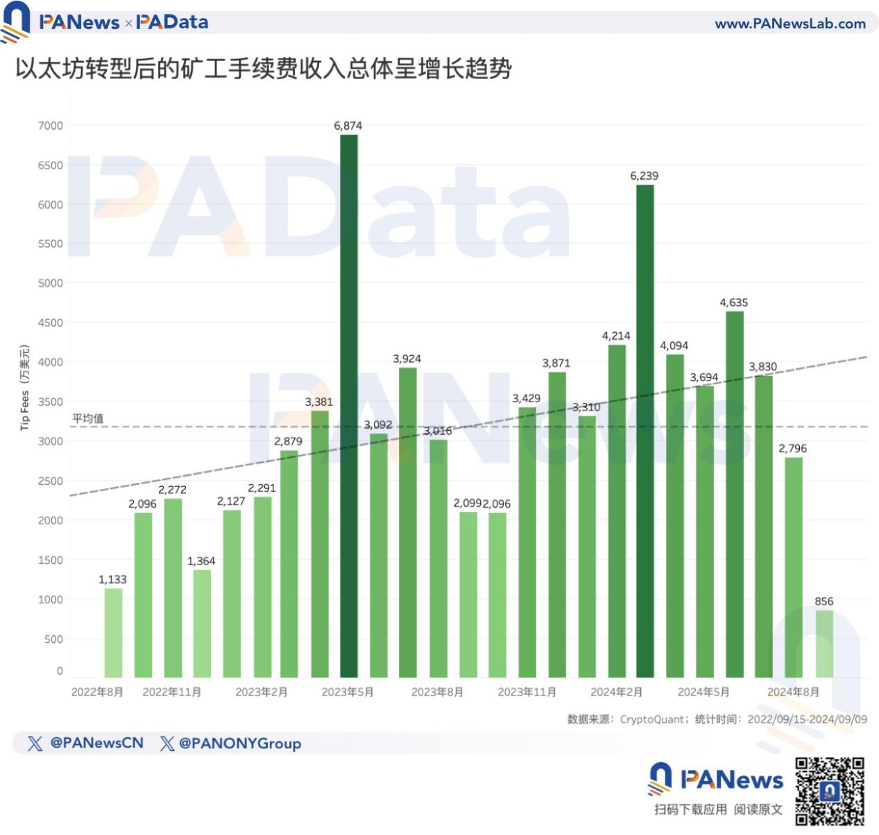 一些质疑认为,ETH 表现不佳的直接原因是手续费收入降低,尽管这是转型后一系列升级的主要目的之一,但这阻碍了 ETH 价值积累。不过,根据 CryptoQuant 统计的数据走势来看,最近两年内,以太坊的交易手续费月收入(仅考虑 Tip 手续费)总体呈现明显的增长趋势。