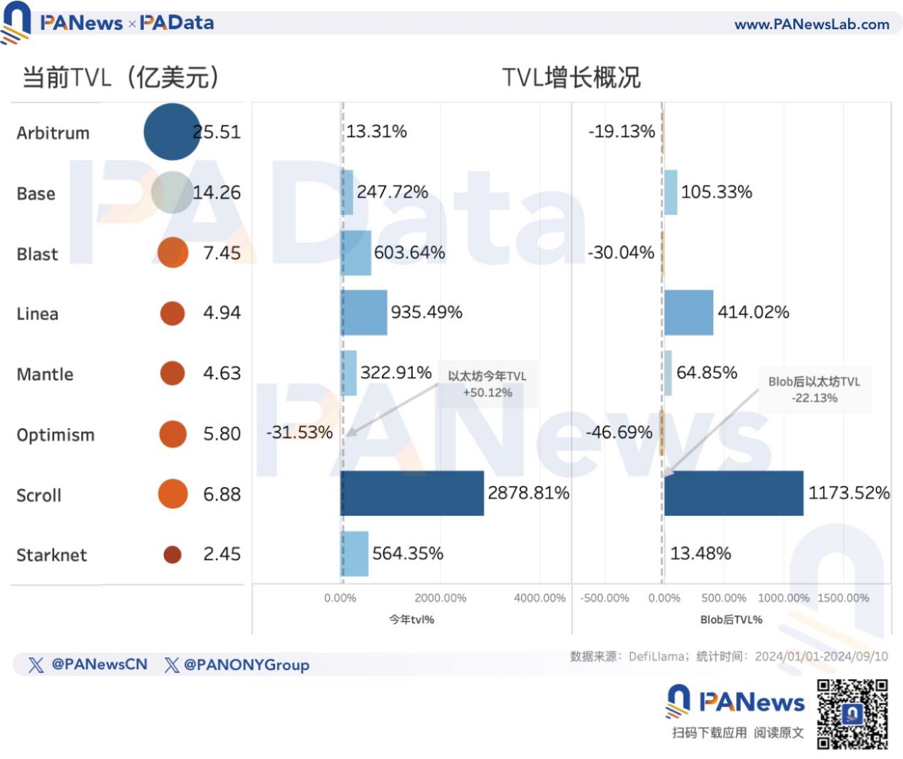 Layer2 的需求增长部分反映到了锁仓量的变化上。根据 DefiLlama 的统计,引入 Blob 后,以太坊的锁仓量下跌了 22.13%,跌幅超过它的只有 Blast 和 Optimism。TPS 增长最快的 Base,其锁仓量增长了 105.33%,支付 Blob 费用第二的 Linea,其锁仓量增长了 414.02%。另外,Arbitrum 的锁仓量虽然也下跌了 19.13%,但跌幅是小于以太坊的。